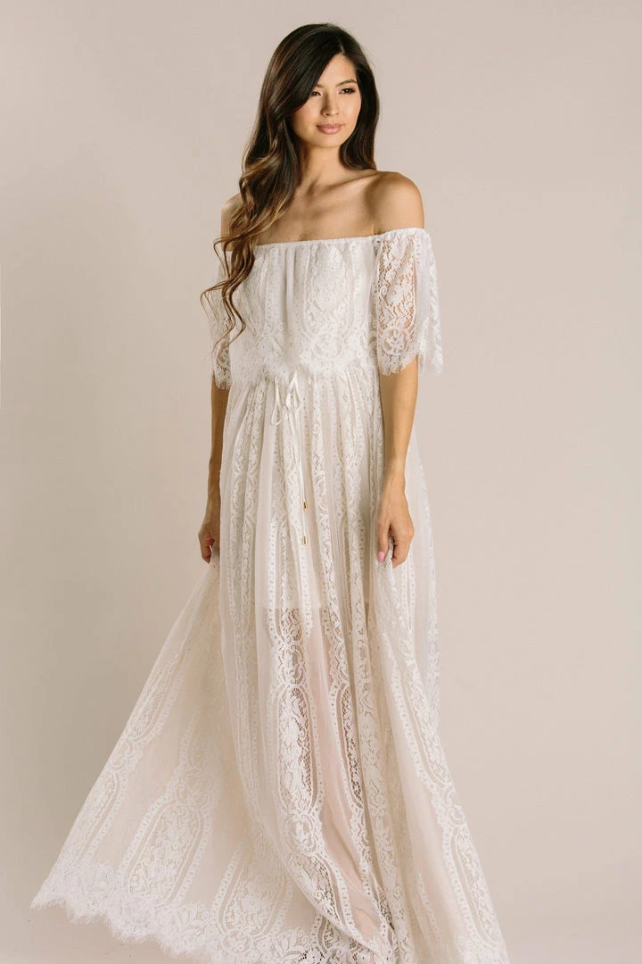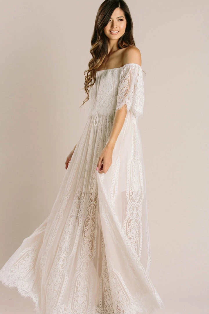 This gorgeous off the shoulder maxi has the prettiest lace from head to toe! We love the white lace, ruffle detail, and elastic waistband. This flattering piece is a great option for your next special occasion! This dress is also a great option for brides – whether you’re wearing it for an engagement shoot, to your bridal shower, or rehearsal dinner!