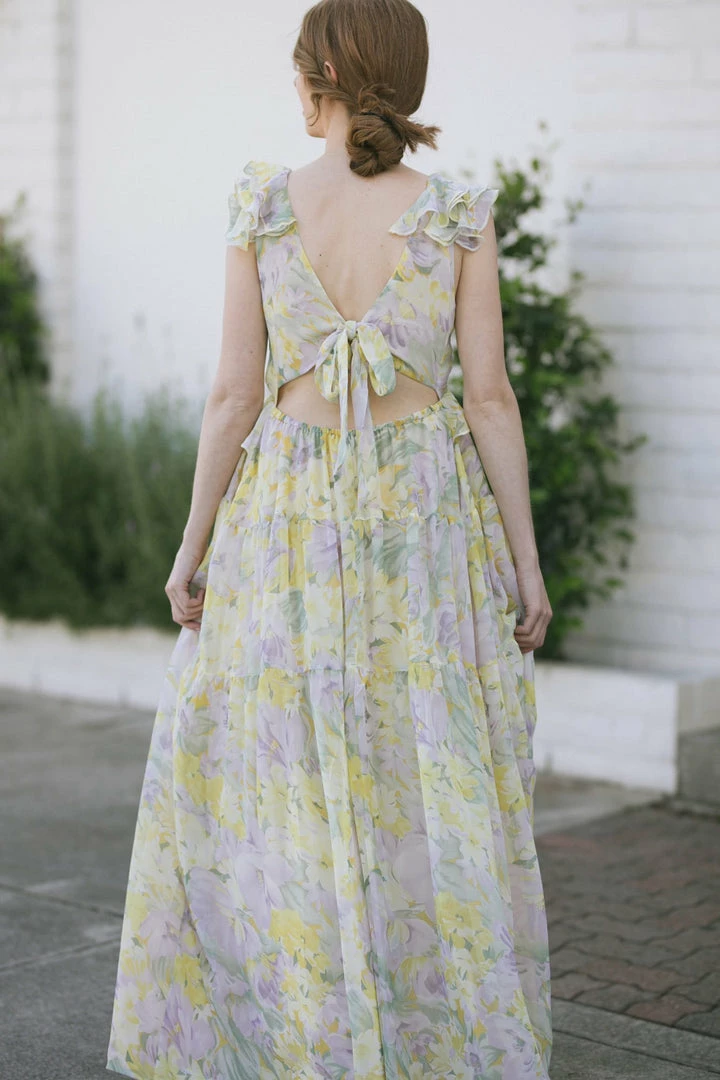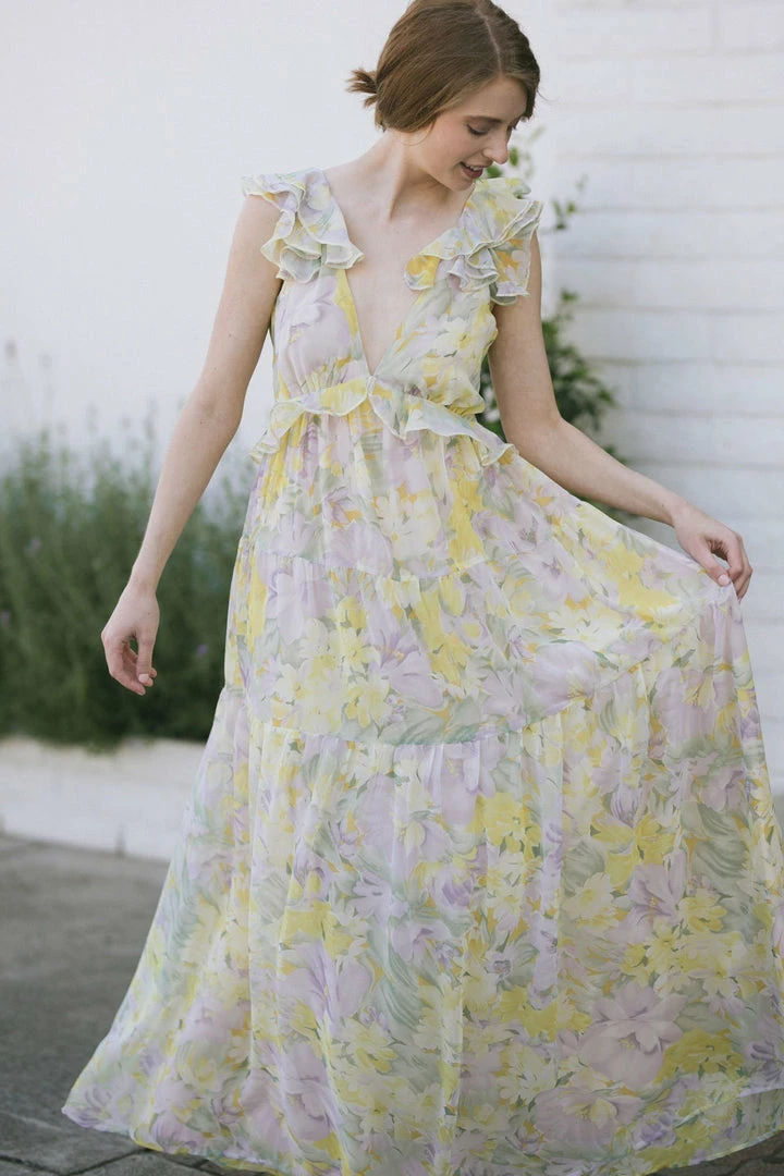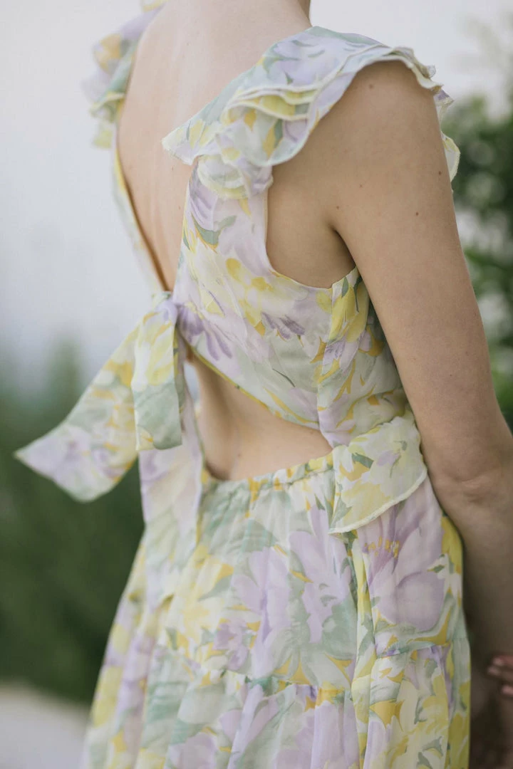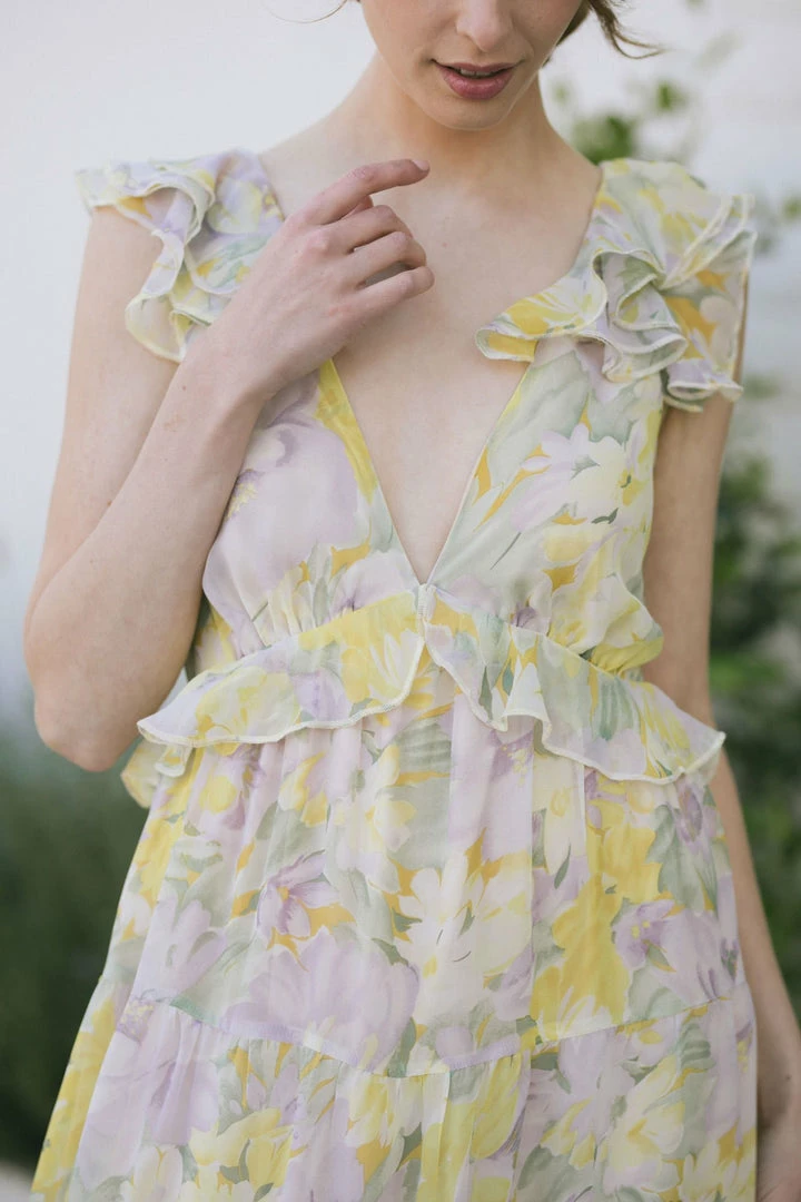 - Feminine ruffles and soft floral pattern