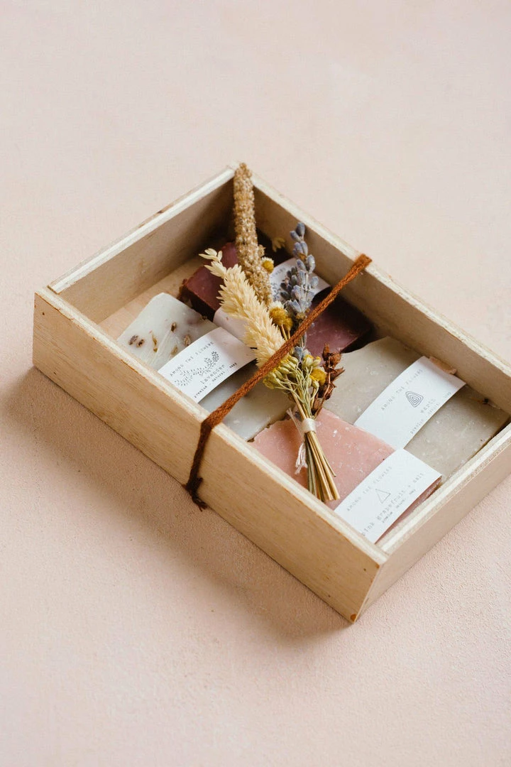 A set of four, one ounce bars of our premium soaps in a sample set. Complete with a sliding sleeve and tied bouquet of wildflowers, this set is gift-ready and swoon worthy.