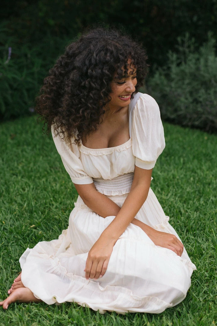 - Style features square neckline with ruffle detail