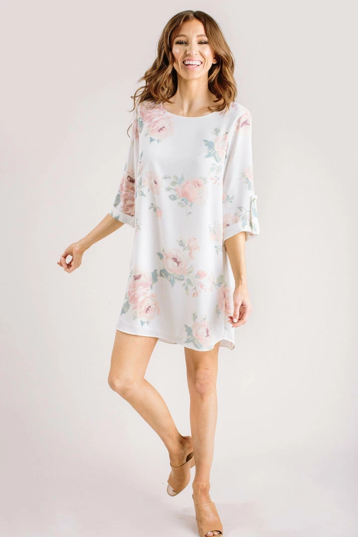 This pretty little shift dress comes in 3 gorgeous exclusive floral prints! We absolutely love how flattering and versatile this piece is! From the button detail 3/4 sleeves, to the perfect length, we absolutely love this dress for all of our Spring and Summer needs. Dress this piece down for a weekend brunch, or dress it up with a crystal necklace and heels for your next wedding!