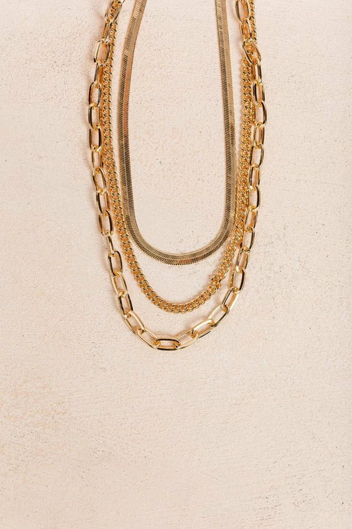 We love this gold layered necklace! The unique and edgy chain detail makes this perfect for wearing with v-neckline tops and dresses! Product may contain lead, cadmium and nickel. Lead and nickel compliant.