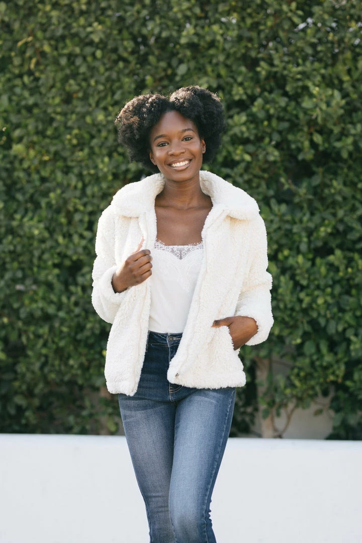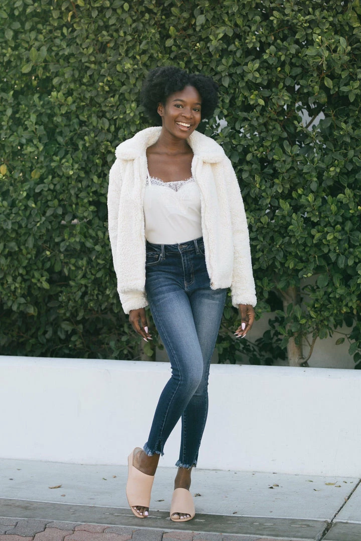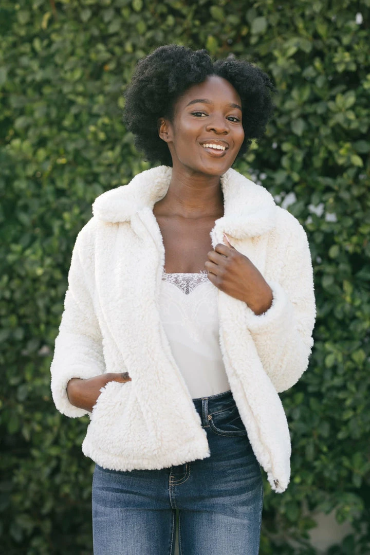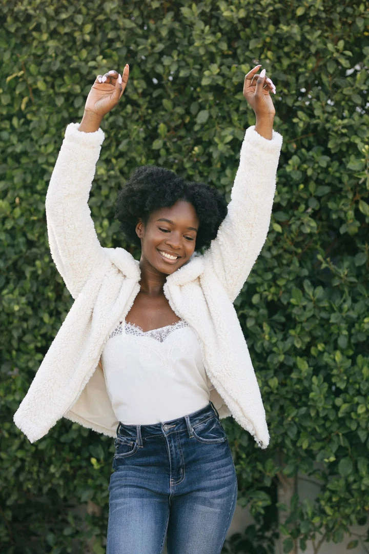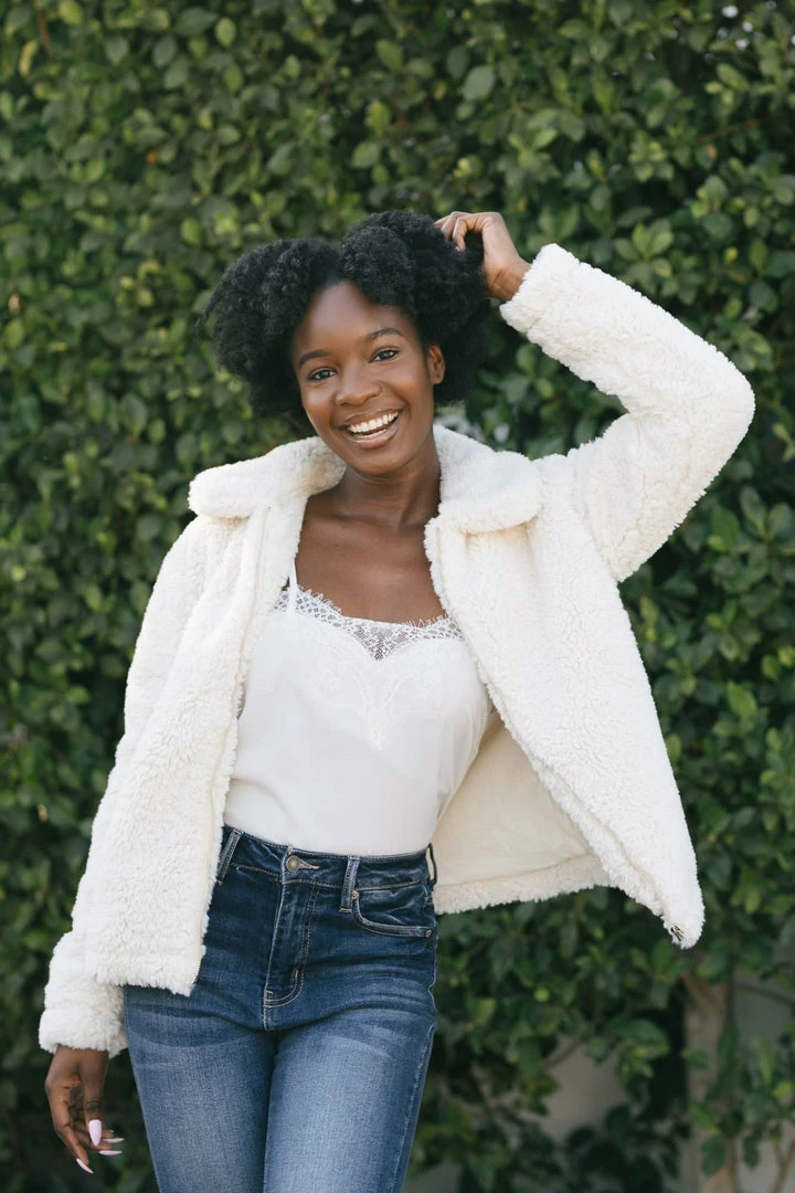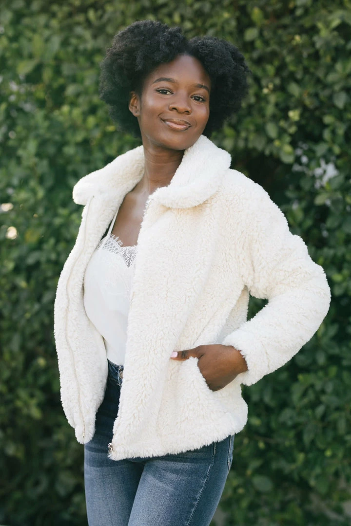Fluffy and warm, the Norah Sherpa Zip Up Jacket will be your go-to piece this season! We love the fun, trendy texture of the sherpa which gives a fun twist to the classic jacket. Made in a flattering hip length and in a versatile cream color – this piece goes with everything!