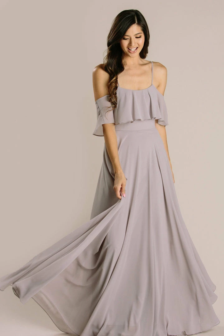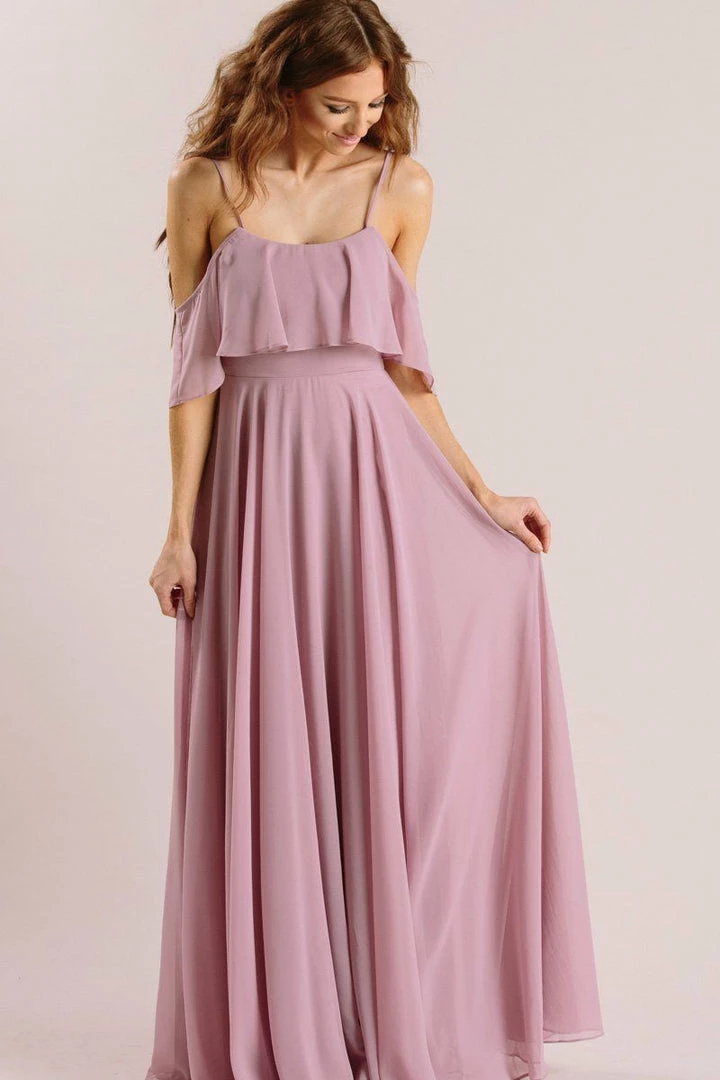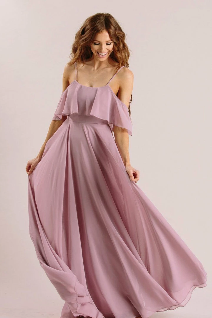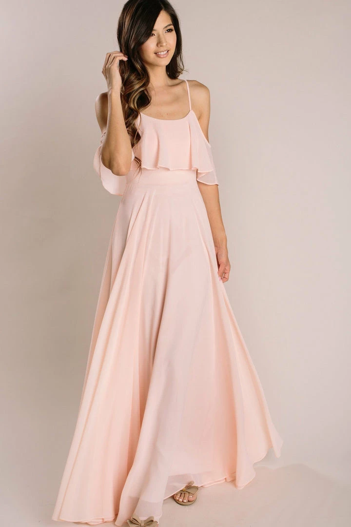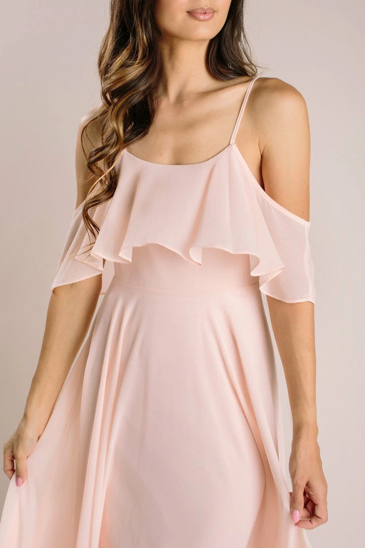 From the flowy layers of this gorgeous maxi dress, to the oversized off the shoulder ruffle detail, we can’t get enough of this stunning piece! This flattering fit and flare is perfect for Spring and Summer weddings, just add one of our crystal statement necklaces and your favorite strappy heels and you’ve got an ensemble that’s sure to dazzle wherever you go! The feminine details and gorgeous blush-pink color makes this a must-have for your next special occasion!