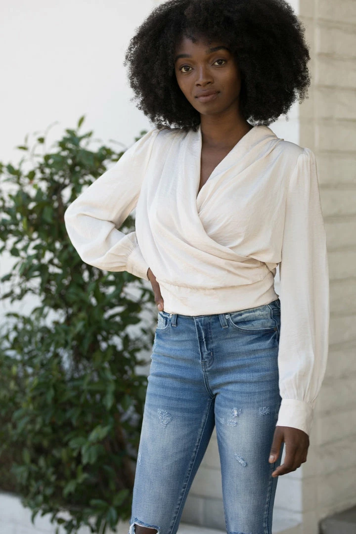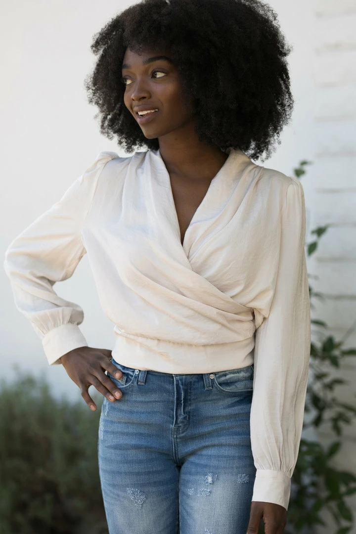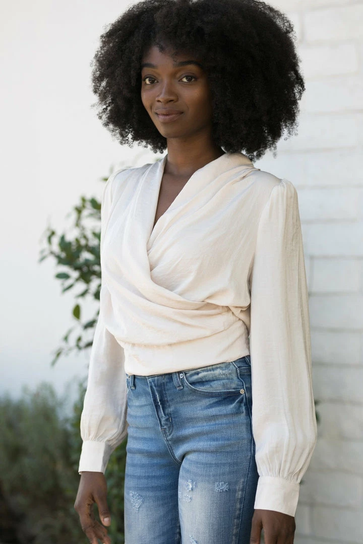 - Shawl style surplice neckline