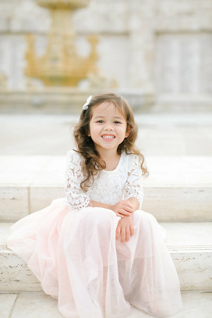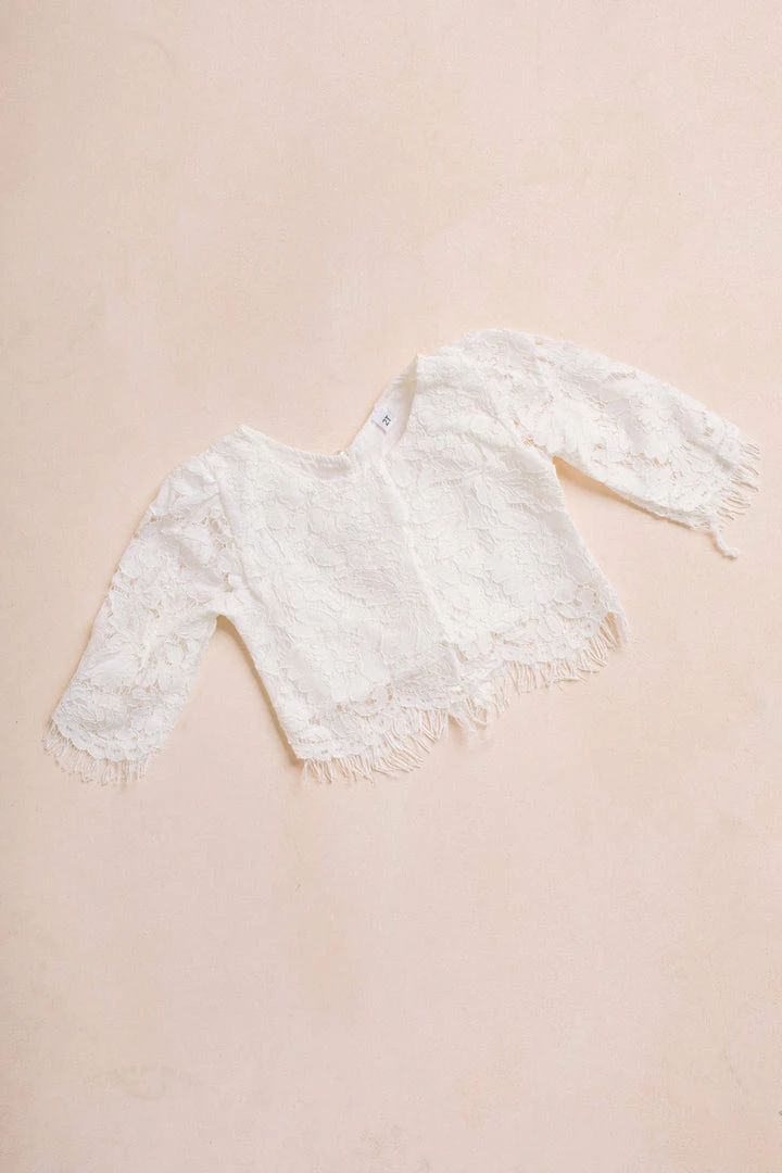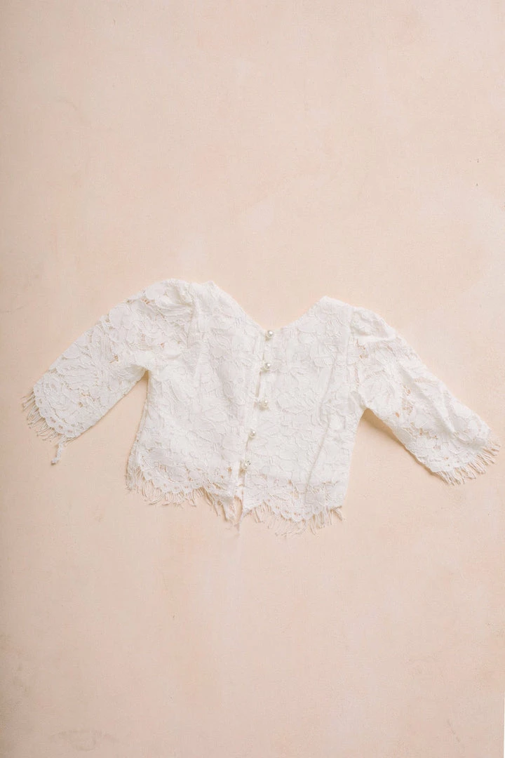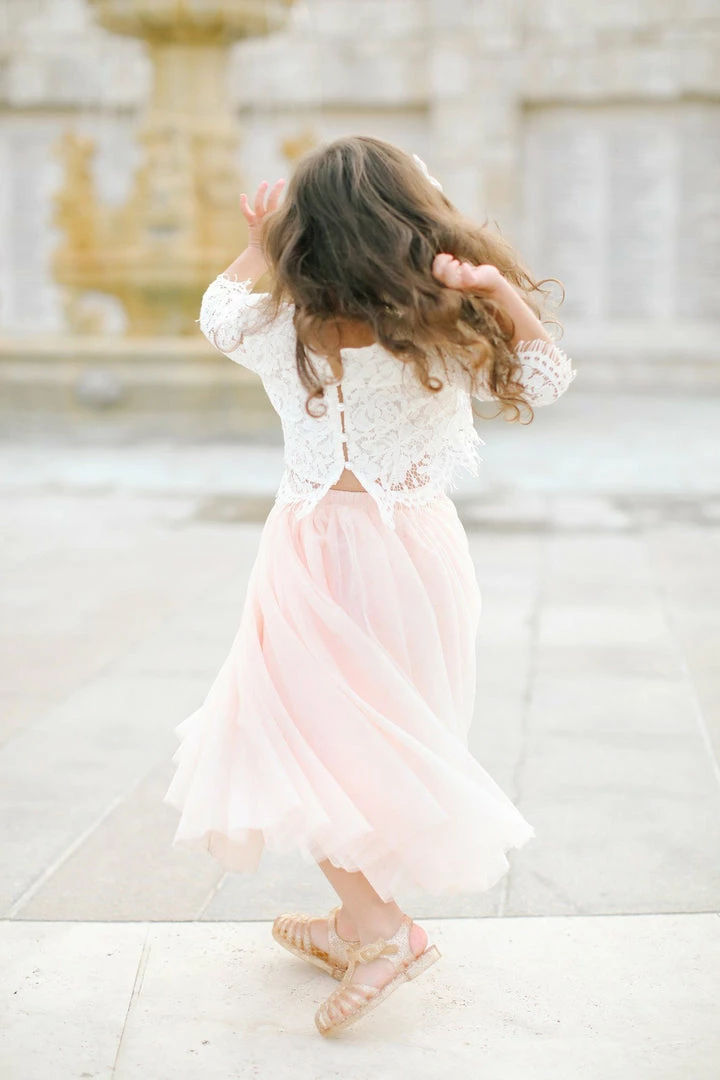 Our soft lace crop top is adorable with quarter length sleeves, scallop trim and pearl back details. The top pairs well with our Kids Tulle Maxi Skirt. Get the set for a complete look.