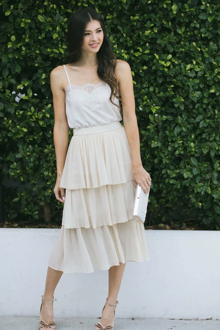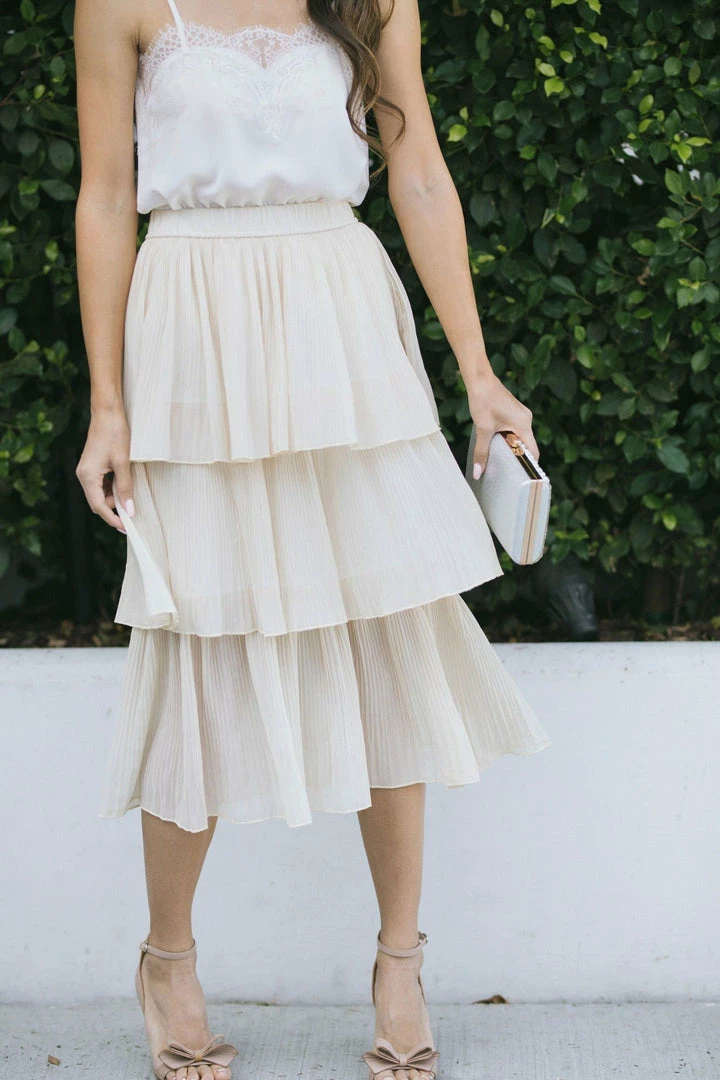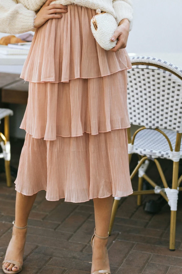 This tulle tiered midi skirt has a dressy gold glitter touch! We love the metallic pleated fabric and the feminine color of this piece. Pair it with a cute sweater top, or a cami and knit cardigan! We love dressing this piece up for date night!