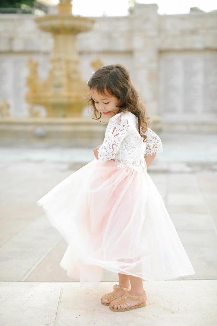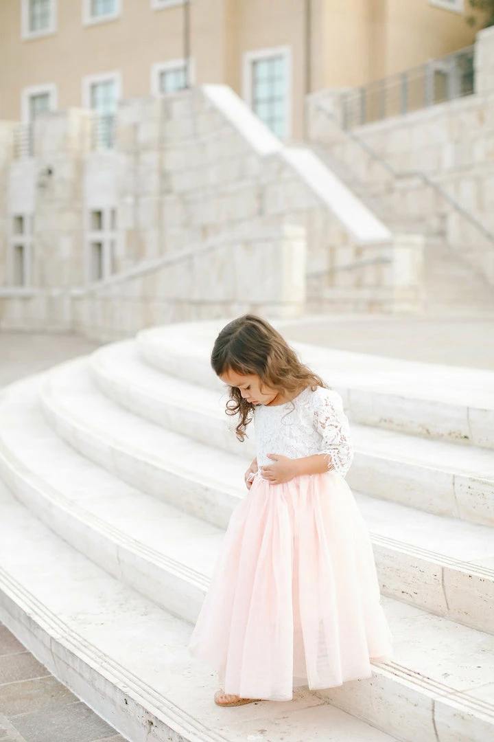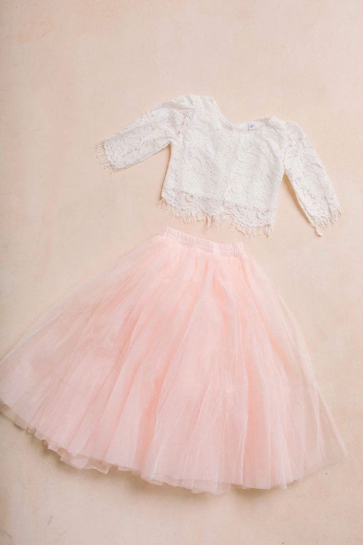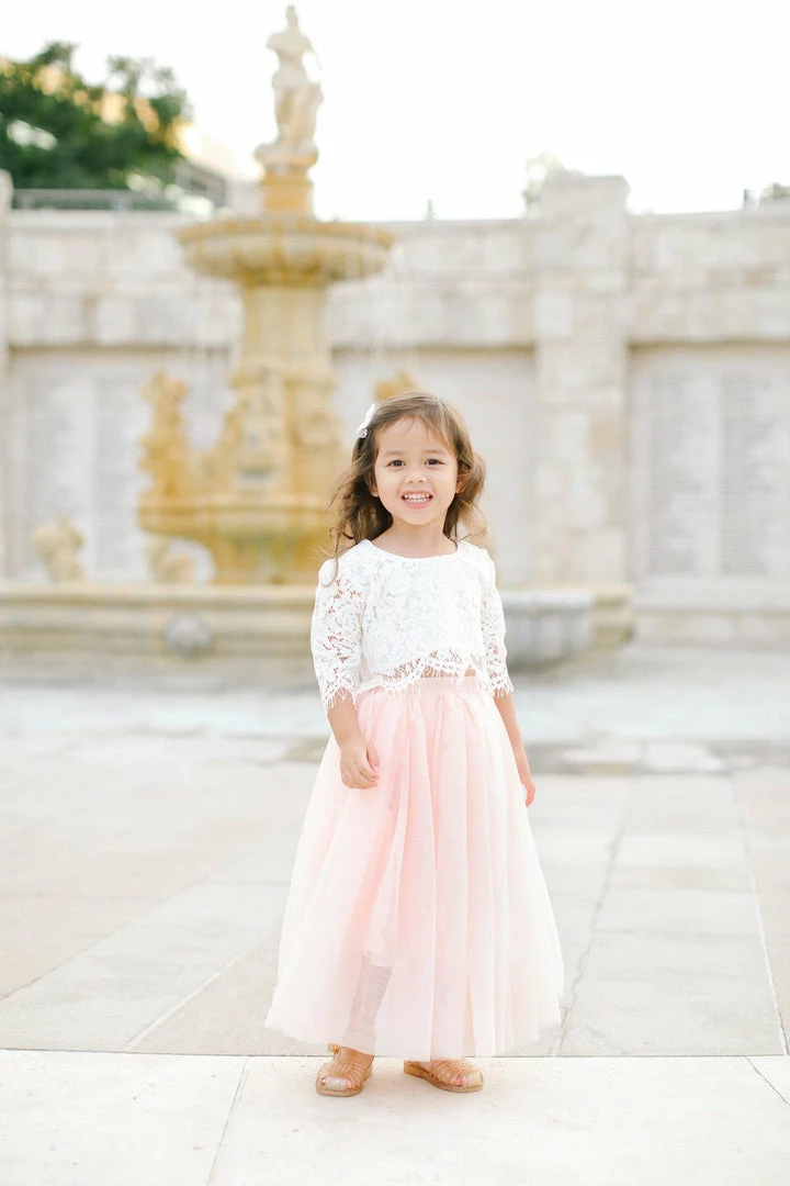 Dress up your little one with our kids tulle maxi skirt. This tulle skirt is perfect for family photos, flower girls or just to make your lil’ one feel special. The full length skirt made with three layers of high quality tulle and an elastic waist. Pair it with our soft lace crop top.